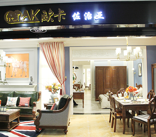 欧卡·佐治亚面料选择上设计师或运用条纹棉麻布料、或选用图文装饰布料或选用进口原生态蜡变皮,并且在加工过程中采用滚边嵌条的工艺方式使其尽显立体、怀旧、复古的美式家具风格。同时,设计师在装修设计上更贴近居家装修模式,主体以线条替代雕花,涂装以素装替代金箔银箔,使现代简约的装修风格取代繁琐、浮夸的累赘装修,同时又不失美式风格,更贴近现代家装市场的需求。