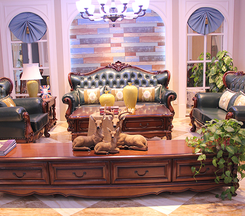 美弗阁家具经典美式奢华优雅深色客厅实木皮质沙发/茶几组合