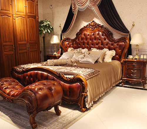 法诗诺家具欧式客厅实木雕花皮艺软靠双人大床/床头柜