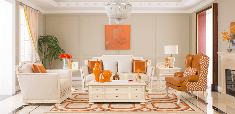 达西美家 美式客厅桃花芯木仿古白三人位布艺沙发/单人位沙发1702/茶几