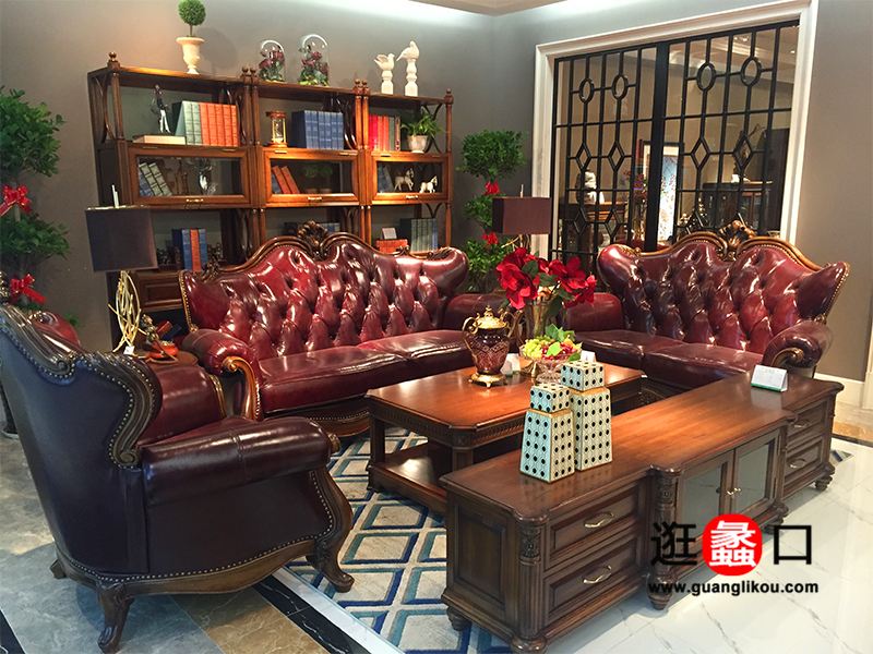 蔻郡家具美式客厅实木真皮单人位+双人位+三人位皮沙发沙发/茶几/电视柜/书柜