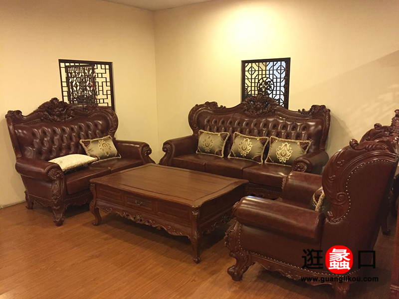 光明红木家具中式古典客厅实木雕花真皮1+2+3沙发