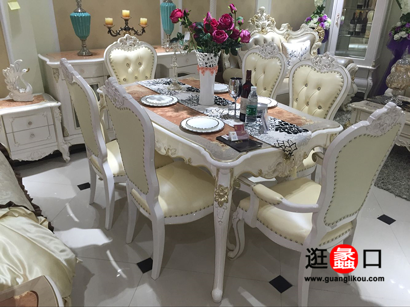 卡吉梦家具欧式餐厅实木雕花真皮餐桌椅