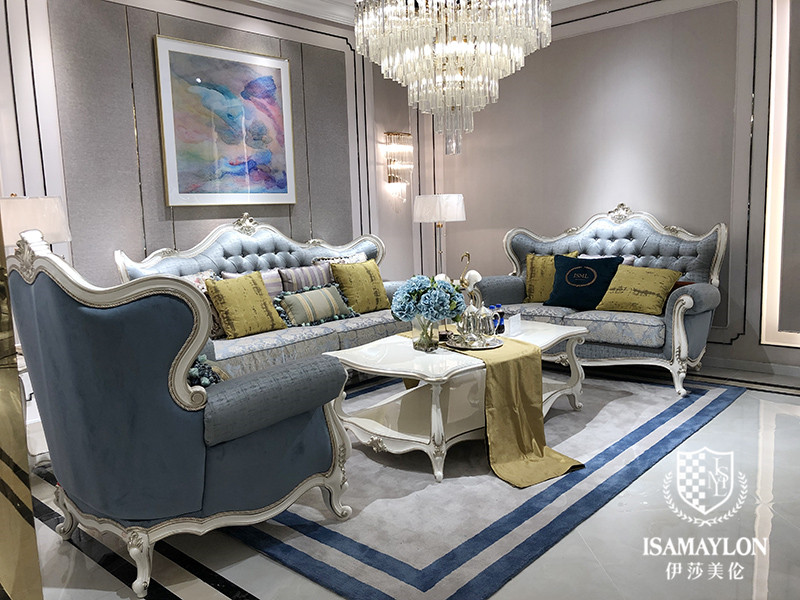 健辉家居·伊莎美伦家具欧式新古典家具欧式蓝色客厅榉木布艺(实木) 单人位+双人位+三人位沙发组合