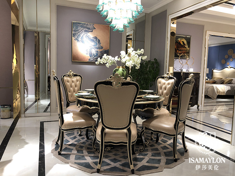健辉家居·伊莎美伦家具欧式新古典家具欧式餐厅榉木(实木)圆形带转盘优雅深色餐桌椅组合