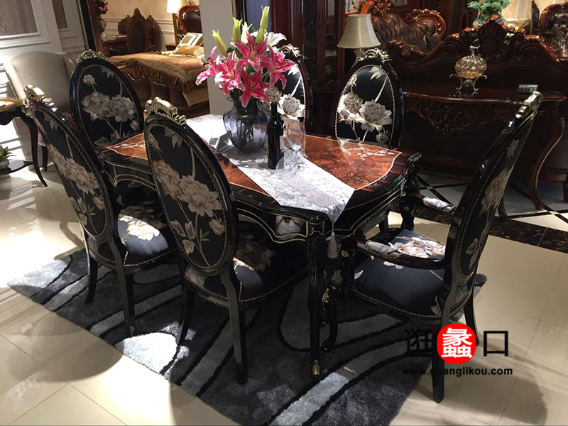 39克拉家居欧式餐厅实木大理石餐桌椅(一桌六椅)