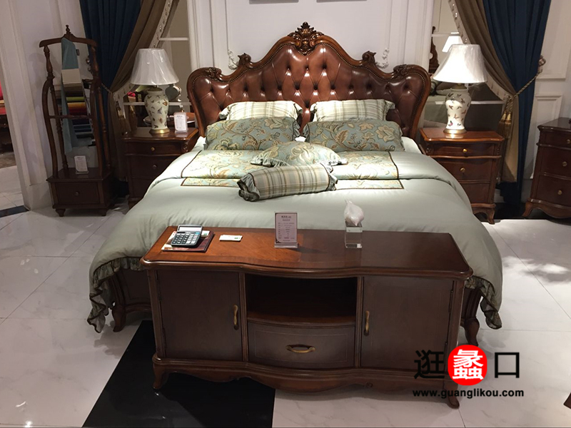 欧美佳家具欧式深色卧室实木真皮双人大床/婚床