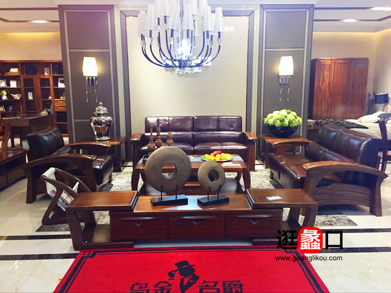 乌金名爵家具新中式客厅双人位/三人位/单人位实木真皮沙发/茶几