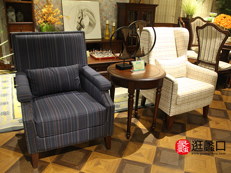 康帝庄园美式客厅实木休闲布艺沙发/老虎椅/小圆几