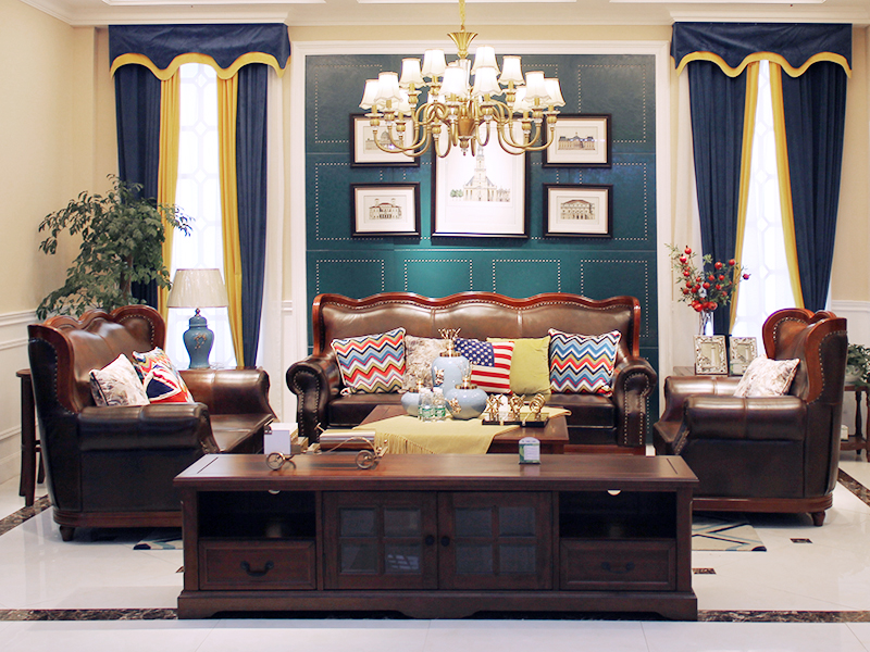 美巴特家具美式客厅实木双人位/三人位/单人位沙发组合/茶几/电视柜