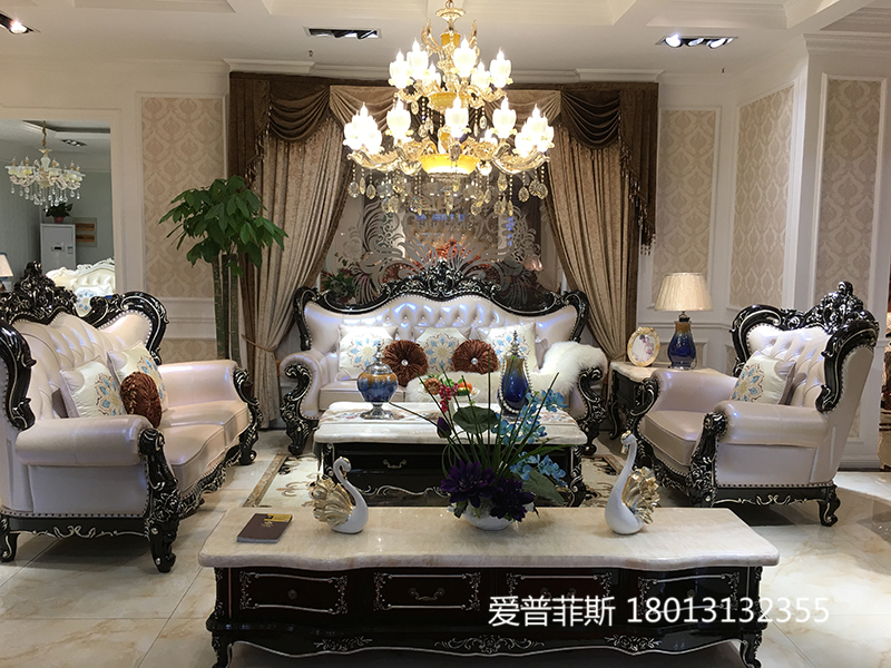 爱普菲斯家具欧式新古典客厅实木雕花皮艺双人位/三人位/单人位沙发组合/大理石茶几/电视柜