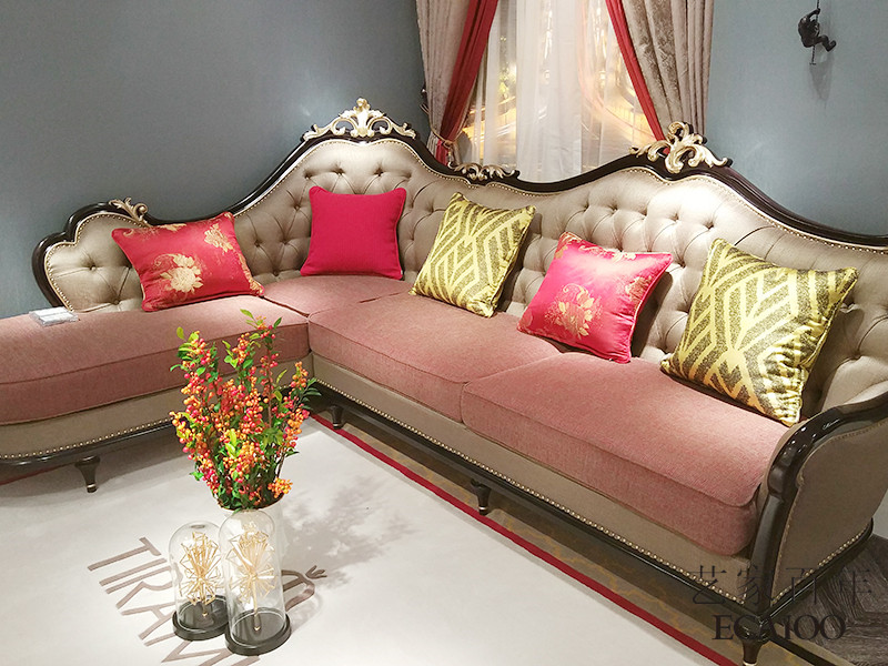 【艺家百年·欧尚格家居】新古典客厅桃花芯木实木带贵妃榻L型沙发茶几组合