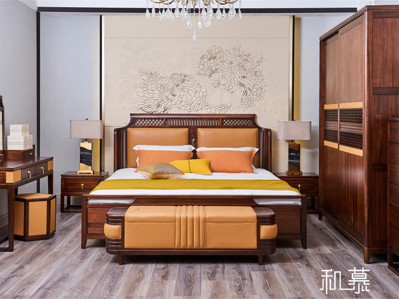 和慕家具新中式卧室时尚雅致软靠双人大床+床头柜组合