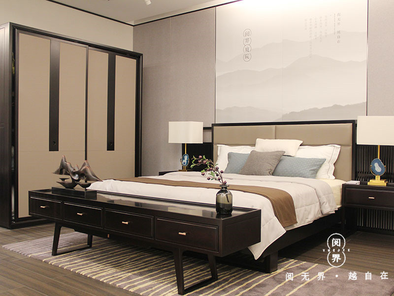 阅界新中式家具新中式卧室紫檀实木典雅大气双人床+床头柜组合