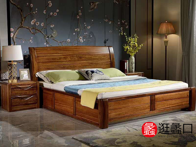 合木源家具中式卧室时尚简约双人大床+床头柜组合