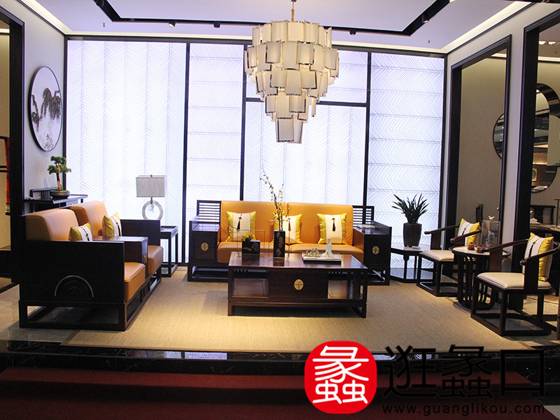 檀樾国俯家具新中式客厅实木皮质多人位+双人位+单人位沙发组合+茶几