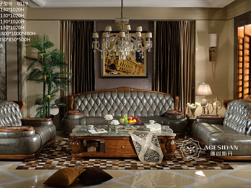 【雅阁斯丹秦·欧尚格家居】欧式客厅乌金木实木皮艺转角贵妃沙发步步高升B款沙发/大理石面茶几
