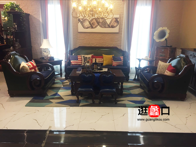 美巴特家具客厅欧式(美式)实木真皮1+2+3沙发组合/茶几/角几