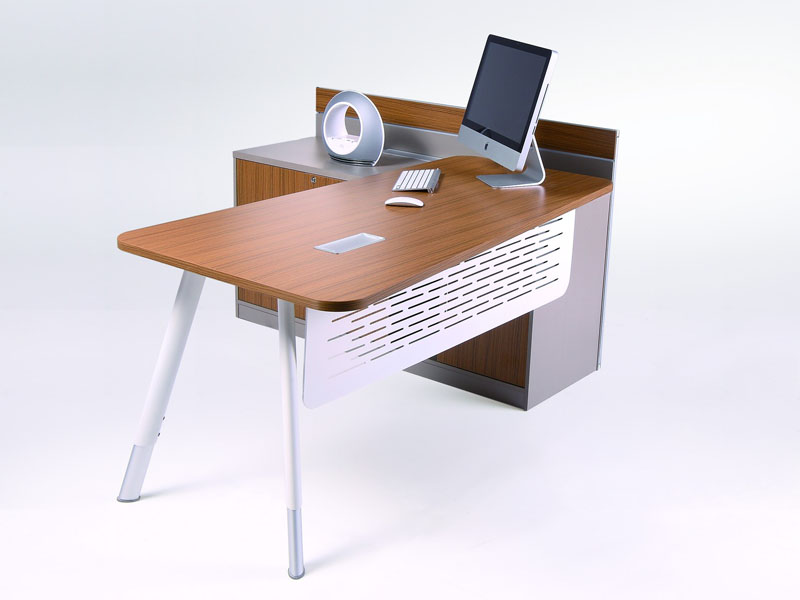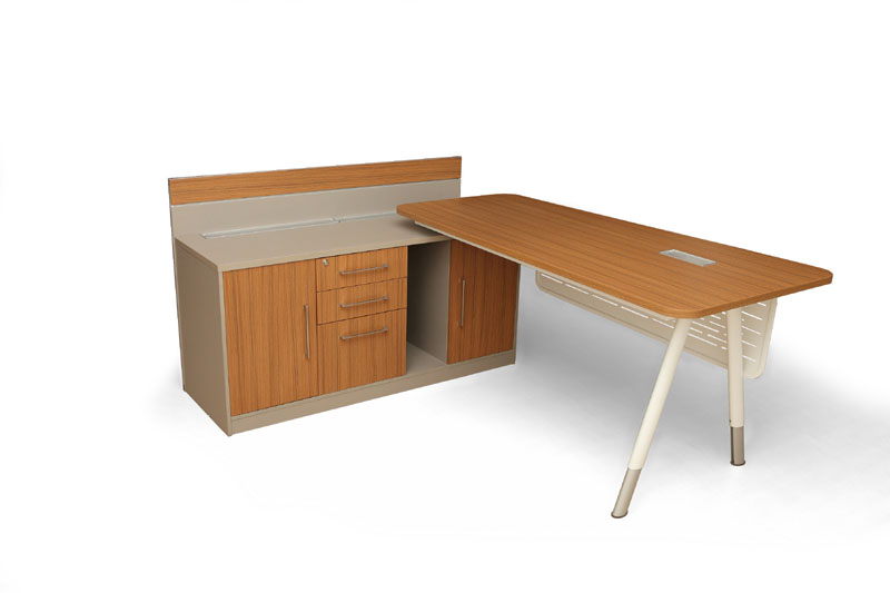 1:台面板,E1级三聚氰胺板柚木色,符合国际E1级环保标准,经过防虫,防腐化学处理,持久不变形, 配长条孔砂纹白钢挡板,副柜采用三节导轨PVC封边,色泽均匀,纹理清晰;