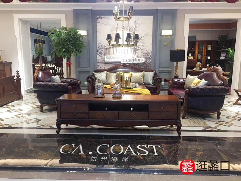 加州海岸家具美式客厅实木皮艺双人位/单人位/三人位沙发/茶几/角几