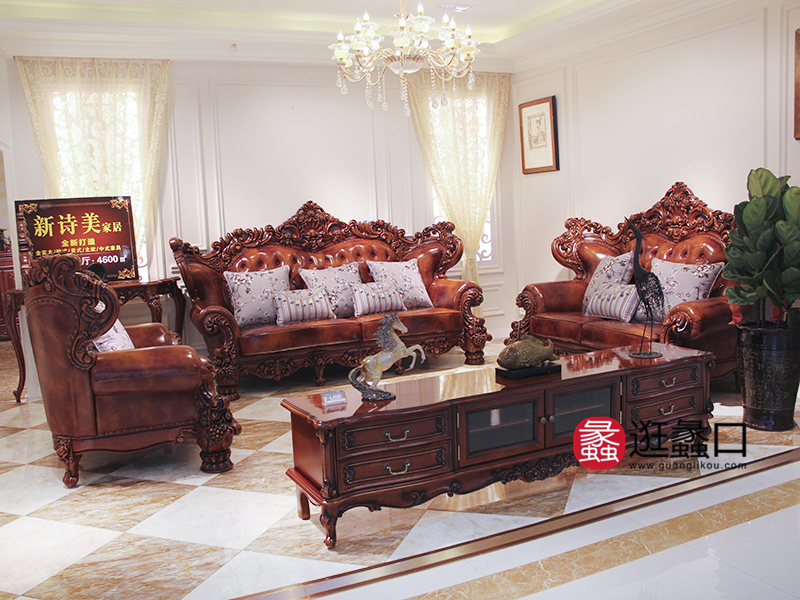 新诗美家居欧美别墅客厅实木雕花进口橡木双人位/三人位/单人位沙发组合/茶几