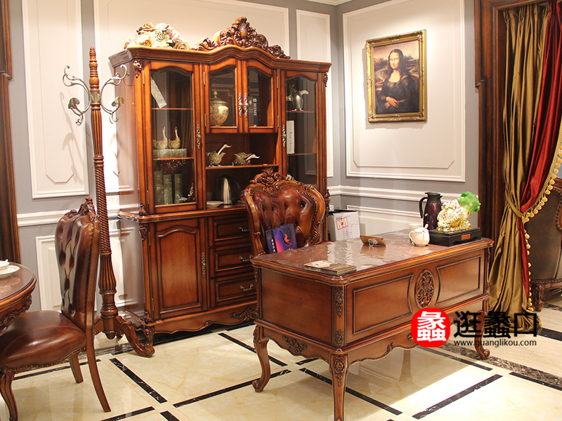 爱美轩家具欧式书房实木雕花书桌椅/书柜